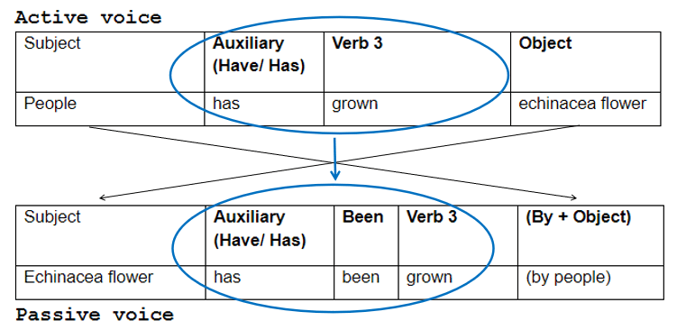 2. Objek kalimat aktif ‘echinacea flower’ berubah menjadi subjek pada kalimat pasif.