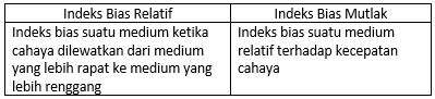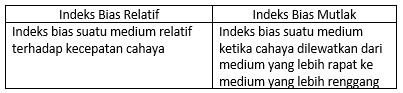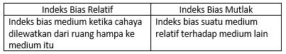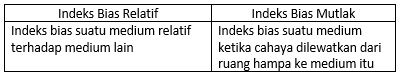 Perbedaan indeks bias relatif dengan indeks bias mutlak adalah ….