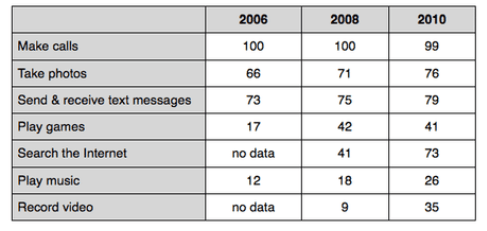 In each of these years, the most frequently used feature was making calls while taking photos and, sending and receiving text messages came in the second and third place. It is noticeable that there were no data about the usage of playing games feature in 2006, but its usage significantly increased from 2008 to 2010. Recording video was the most rarely used feature of all.