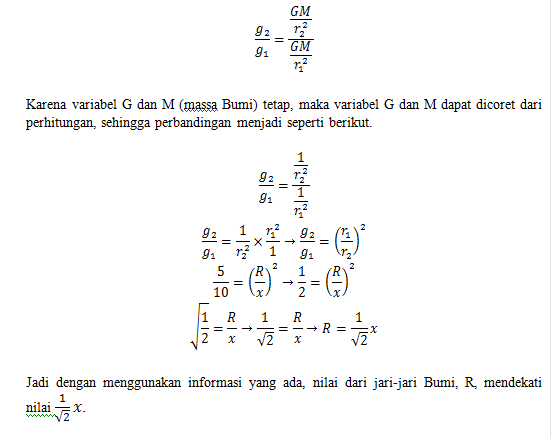 Percepatan gravitasi di permukaan Bumi adalah 10 N/kg. Jika pada suatu titik di luar Bumi yang berjarak x dari pusat Bumi merasakan percepatan gravitasi sebesar 5 N/kg, maka jari-jari Bumi kira-kira mendekati nilai .…