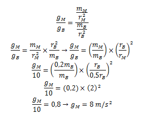 Percepatan gravitasi pada permukaan Bumi adalah 10 m/s2. Massa planet Mars adalah 0,2 kali massa Bumi dan jari-jari planet Mars 0,5 kali jari-jari Bumi. Percepatan gravitasi yang dialami sebuah benda yang berada pada permukaan planet Mars adalah .…