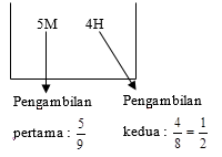 Percobaan dengan mengambil kelereng secara bergantian masing-masing satu buah dari dalam kantung berisi 5 kelereng merah dan 4 kelereng hijau. Jika dalam setiap pengambilan tanpa dikembalikan, maka peluang kejadian terambilnya satu kelereng merah dan satu kelereng hijau adalah… (UN 2014)