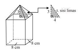 Diketahui balok berukuran 8 cm × 8 cm × 11 cm. Jika tinggi limas 3 cm. Luas permukaan bangun di atas adalah .…