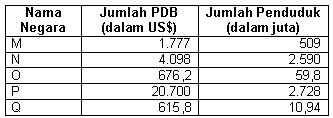 Perhatikan daftar tabel berikut yang memuat jumlah PDB dan jumlah penduduk.