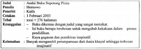 Buku karya Hernowo berisi uraian tentang buku yang diumpamakan sepotong pizza. Dengan contoh berasal dari dunia khayalan, orang-orang akan tertarik untuk memilikinya karena memiliki judul yang memikat.