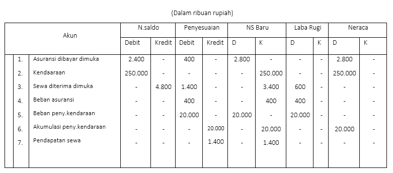Berdasarkan neraca saldo dan data penyesuaian di atas, disusun kertas kerja sebagai berikut:
