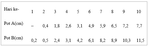 Perhatikan data pengamatan panjang tanaman kacang hijau pada dua pot selama 10 hari berikut:
