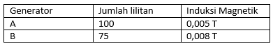 Jika kedua generator berputar dengan frekuensi yang sama, perbandingan ggl induksi yang dihasilkan generator A terhadap generator B adalah ….