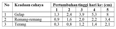 Perhatikan data tinggi tumbuhan pada keadaan cahaya yang berbeda berikut ini: