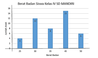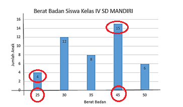 Selisih berat badan siswa yang memiliki berat badan 45 kg dan 25 kg adalah …