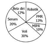 Diagram lingkaran di atas menunjukkan kegemaran 200 siswa dalam mengikuti ekstrakurikuler di suatu sekolah. Banyaknya siswa yang gemar MIPA adalah….