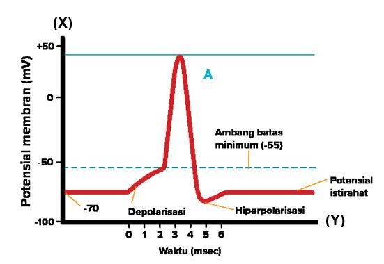 terjadi penurunan potensial membran akson karena membukanya protein kanal ion Na+ sehingga ion K+ untuk bergerak ke dalam