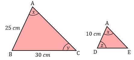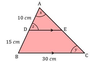 Panjang AD = 10 cm, BD = 15 cm dan BC = 30 cm. Jika segitiga ABC dan segitiga ADE sebangun maka panjang DE adalah ….