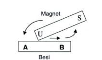 Batang besi AB akan dibuat magnet dengan cara digosok berulang-ulang menggunakan magnet batang secara searah seperti pada gambar. Kutub – kutub magnet dan sifat magnet yang terjadi pada batang besi AB adalah ….