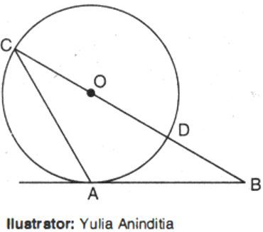 adalah garis singgung pada lingkaran (). Garis melalui pusat dan memotong lingkaran di . Jika sama kaku dengan dan , panjang tali busur adalah ...