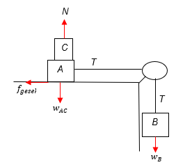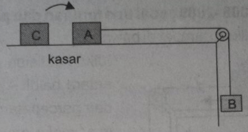 Balok A dan B dengan massa masing-masing 8 kg dan 5 kg dihubungkan dengan tali melalui katrol seperti gambar. Koefisien gesekan statis dan kinetis antara balok dengan lantai adalah 0,5 dan 0,3 (g = 10 m/s²). Balok C yang massanya 4 kg kemudian diletakkan di atas balok A, maka ....