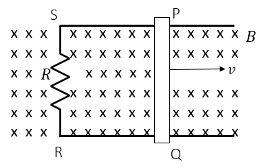 Batang konduktor dengan panjang 50 cm ditarik dengan kecepatan 2 m/s seperti pada gambar di atas. Jika medan magnet bernilai seragam sebesar 4 × 10×-5 T dan besarnya hambatan adalah 0,04 ohm, besar dan arah arus induksi yang muncul adalah ….