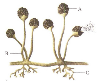 Berdasarkan gambar Rhizopus tersebut, tuliskan nama dan fungsi bagian yang ditunjukkan oleh huruf A, B, dan C!