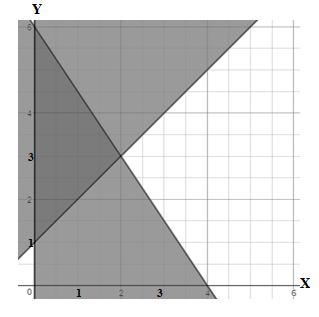 Daerah yang berawarna paling hitam adalah daerah penyelesaian suatu sistem pertidaksamaan. Nilai maksimum dari pada daerah tersebut adalah ….