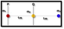 Diketahui m1 = 1 kg, m2 = 2 kg, dan m3 = 3 kg. Besar momen inersia sistem di atas jiika porosnya berada di titik P adalah ...