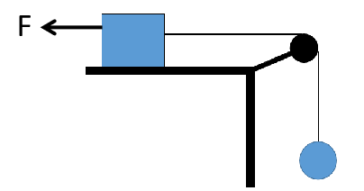 Diketahui massa kotak 2 kg dan massa bola 1 kg. Permukaan lantai kasar dengan , serta tali dan katrol dianggap tidak bermassa sehingga gesekan antara tali dan katrol diabaikan. Bila kotak ditarik dengan gaya F = 20 N ke kiri, percepatan kotak sebesar ….