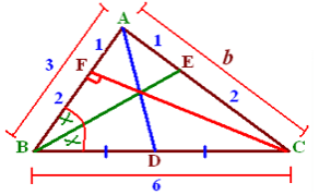 Diketahui segitiga dengan panjang AB = 3 cm dan BC = 6 cm. Jika garis berat AD, garis bagi BE, dan garis tinggi CF berpotonganpada satu titik O. Maka panjang AC adalah....
