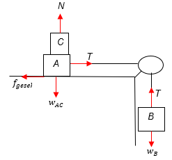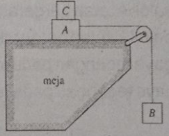 Ditentukan: mA = 4 kg, mB = 5 kg, g = 10 m/s². Koefisien gesek antara benda A dengan C adalah 0,3 dan antara A dengan meja 0,2. Sistem tidak bergerak. Dari pernyataan-pernyataan berikut: