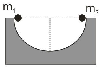Dua bola kg dan kg dilepas dari ketinggian yang sama melewati lintasan lengkung licin seperti pada gambar. Kedua bola kemudian saling bertumbukan secara tidak lenting sama sekali. Jika jari-jari kelengkungan meter, maka kecepatan akhir bola adalah …. (g = 10 )