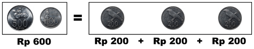 Terdapat 3 keping uang Rp200,00 sehingga total nilai uangnya adalah 3×Rp200,00=Rp600,00.