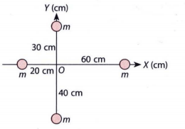 Empat buah partikel masing-masing bermassa sama, yaitu 400 g dihubungkan dengan batang ringan (massa diabaikan) seperti gambar di atas. Hitunglah momen inersia sistem, jika sistem partikel diputar dengan poros x