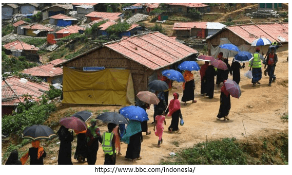 Gambar di atas merupakan potret warga minoritas muslim Rohingya yang harus melarikan diri ke Bangladesh untuk menghindari kekerasan di negara bagian Rakhine oleh otoritas Myanmar. Analisa yang tepat terkait peran Indonesia dalam penyelesaian masalah krisis kemanusiaan di Rakhine Myanmar adalah ….