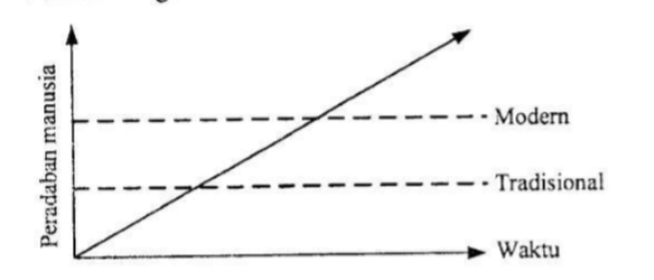 Teori linier ialah teori yang mengatakan perubahan sosial bisa direncanakan atau diarahkan ke suatu titik tujuan tertentu. Mereka percaya bahwa masyarakat berkembang dari tradisional menuju masyarakat kompleks yang modern. Apabila kita cermati gambar pada soal ini, jelas terlihat gambaran perubahan masyarakat dari tradisional menuju modern sehingga bentuk perubahan sosialnya berpola linier.