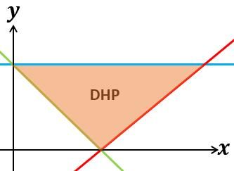 Gambar segitiga samasisi di atas adalah daerah penyelesaian dari sebuah sistem pertidaksamaan (garis biru sejajar sumbu-x). Diketahui luas segitiga tersebut adalah satuan luas dan salah satu titik sudutnya berada di . Nilai maksimum berdasarkan titik ekstrim daerah penyelesaian tersebut adalah ....