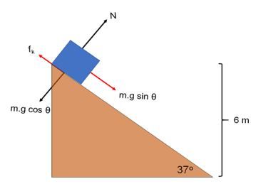 Sebuah balok bermassa 2 kg diletakkan pada puncak bidang miring. Permukaan bidang miring kasar dengan koefisien gesek kinetis 0,3. Balok kemudian bergerak dari puncak ke dasar bidang miring. Besar gaya gesek yang dialami balok adalah … .