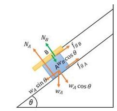 Balok A dengan massa 3m kg bergerak dengan laju konstan sepanjang bidang miring kasar dengan kemiringan θ (tanθ = 4/3), sementara balok B dengan massa m kg, diam di atas balok A. Balok B terhubung dengan dinding melalui sebuah tali ringan dan tidak elastik seperti pada gambar. Jika koefisien gesek kinetik antara balok A dengan bidang miring dan antara balok A dan balok B bernilai sama, maka nilai koefisien gesek kinetiknya adalah ….