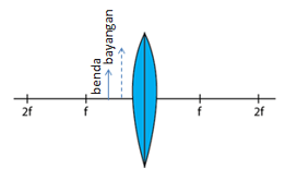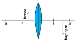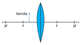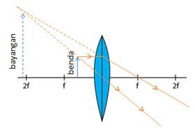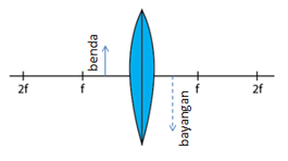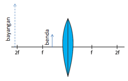 Benda diletakkan di antara lensa dengan titik fokus. Letak bayangan yang terbentuk dari lensa tersebut ditunjukkan oleh gambar ....
