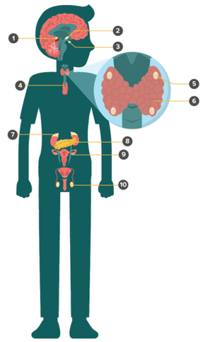 Berdasarkan gambar di atas, Hipotalamus, kelenjar adrenal, dan kelenjar tiroid ditunjukan oleh nomor …..
