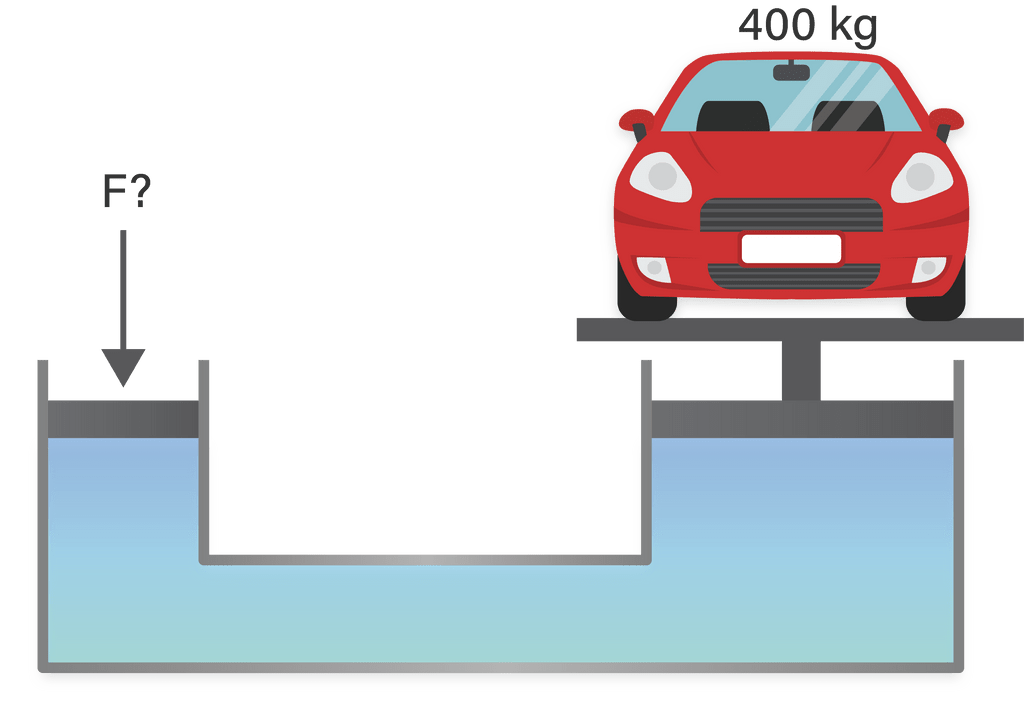 Perhatikan gambar berikut ini. Bila luas penampang pengisap kecil adalah 20 cm2 dan luas penampang pengisap besar adalah 50 cm2, dan percepatan gravitasi adalah 10 m/s2, maka besarnya gaya (F) yang harus diberikan agar dapat mengangkat mobil adalah ....