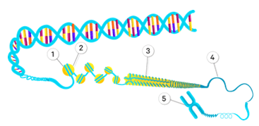 DNA penyusun tubuh kita merupakan untai ganda dan berpilin yang memiliki ukuran yang sangat panjang, akan tetapi DNA tersebut dapat dikemas di dalam sel. Berdasarkan gambar tersebut bagian yang berperan dalam proses pengemasan DNA ditunjukan oleh nomor….