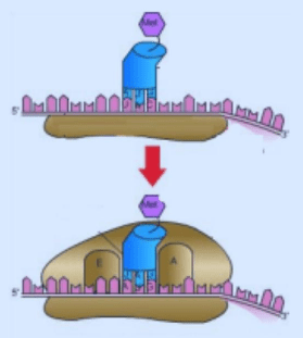 Gambar tersebut di atas merupakan salah satu tahapan dari sintesis protein. Tentukan langkah-langkah sintesis protein selanjutnya sampai terbentuknya rangkaian asam amino!