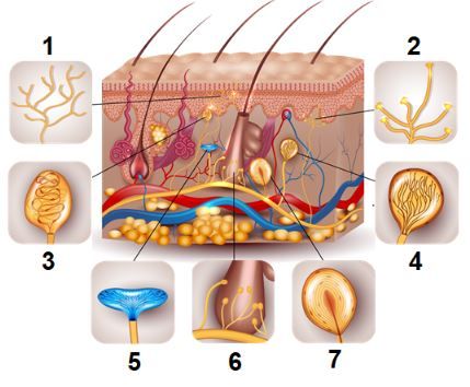 Gambar pada soal merupakan berbagai jenis reseptor yang dapat ditemukan pada organ kulit. Tiap reseptor memiliki nama dan fungsi yang berbeda. Untuk lebih jelas, macam-macam reseptor pada kulit dapat dilihat pada gambar berikut ini: