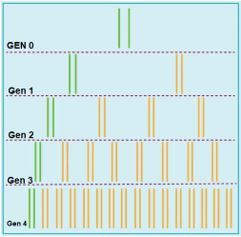 Jika garis hijau adalah untai DNA lama dan garis jingga adalah untai DNA baru, maka jenis replikasi DNA yang ditunjukkan pada gambar tersebut adalah ….
