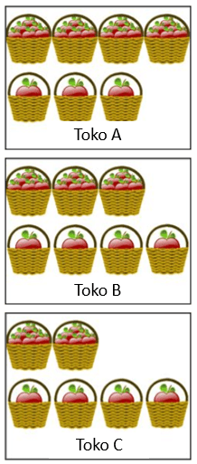 Jika satu keranjang besar berisi 10 buah apel, dan keranjang kecil berisi 1 buah apel, maka urutan dari toko yang mempunyai apel terbanyak adalah…