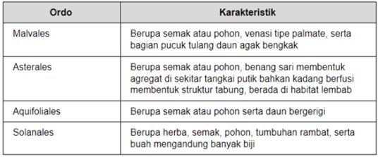 Ordo dan karakteristik yang tepat dari tumbuhan tersebut adalah….