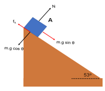 Sebuah balok bermassa 5 kg diletakkan pada puncak bidang miring. Permukaan seluruh bidang kasar dengan koefisien gesek kinetis yang sama, baik di bidang miring maupun bidang datar. Balok bergerak dari titik A ke titik B. Total usaha oleh gaya gesek pada bidang miring dan bidang datar adalah -60 Nm. Besar nilai koefisien gesek kinetisnya. .