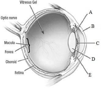 Seorang dokter dapat memeriksa kondisi kehidupan dari pasiennya dengan memberikan sorotan lampu senter ke arah mata. Pada orang yang masih hidup, pemberian cahaya akan direspon melalui perubahan diameter bagian tertentu. Akan tetapi, pada orang mati bagian tersebut tidak akan merespon terhadap cahaya senter. Bagian yang dimaksud adiberi label...