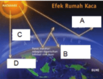 Perhatikan gambar berikut ini. Terjadinya efek rumah kaca digambarkan dalam bentuk garis sinar matahari, garis sinar manakah yang menggambarkan terjadinya efek rumah kaca tersebut ....