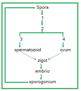 Tumbuhan lumut dan protonema secara berurutan ditunjukkan oleh nomor …