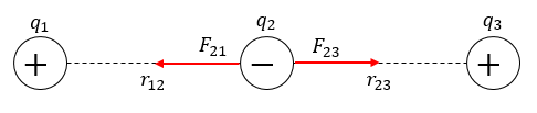 Jika = 1 μC, = -2 μC, dan = 4 μC dengan maka besar dan arah gaya coulomb yang dialami adalah ….