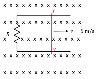 Kawat XY panjangnya 120 cm digerakkan dalam medan magnet homogen yang besar induksi magnetiknya 0,5 T. Jika kecepatannya 5 m/s dan hambatan rangkaian 4 ohm,